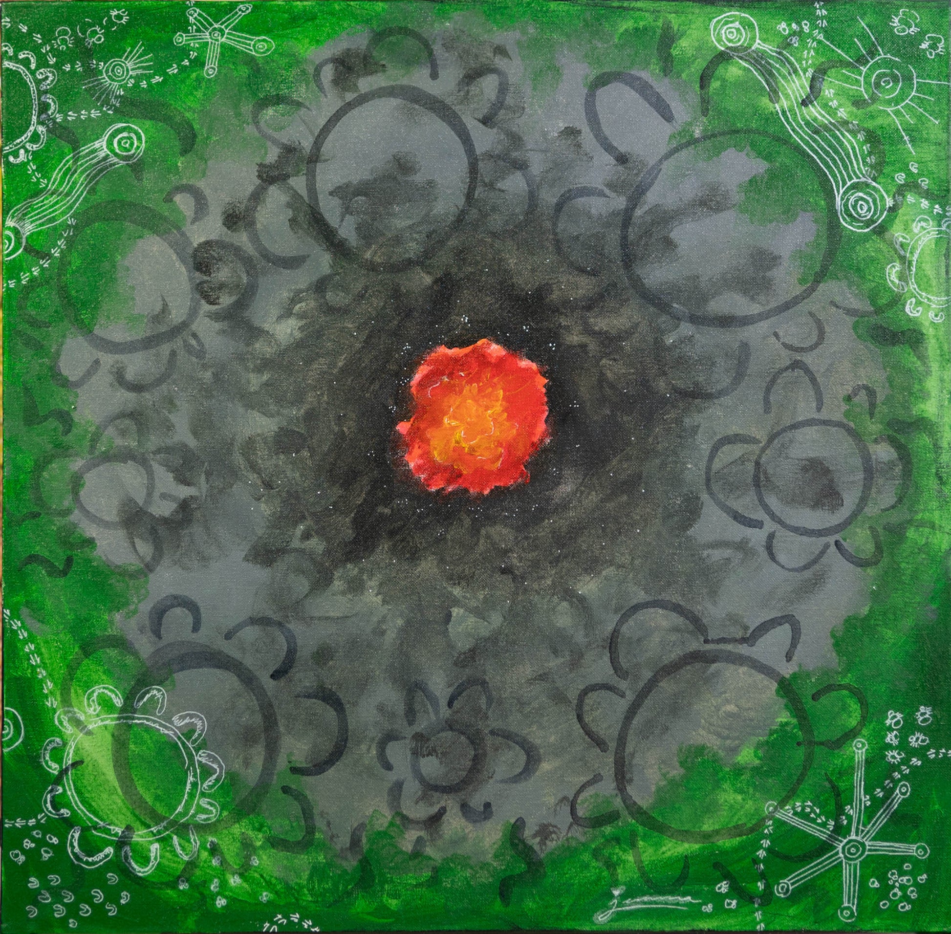 This painting depicts a burning fire, followed by a vastness of ash, that eventually forms into a green field. The painting represents the growth that follows soon after fire. It expresses to never give up after something significant and difficult happens in life, because good will always come.