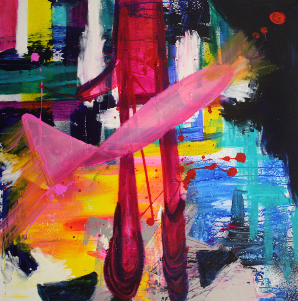 In this artwork I portrayed Baarka’s strength and attitude. The geometric coloured shapes in the background echo the rhythm and percussive element of rap, while paint applied with my hands adds to the rawness of the work. The many different textures, colours and patterns visually represent the many different layers and influences in the song.