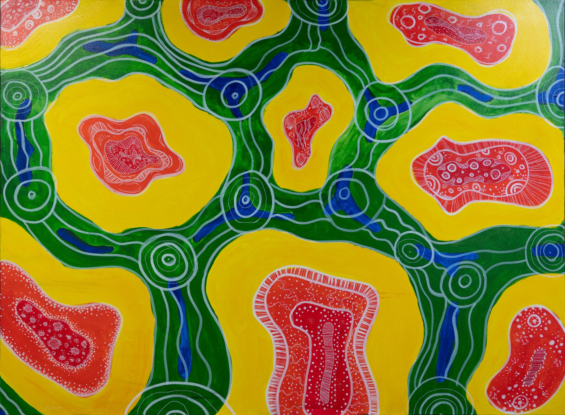 This picture depicts the constant flow of Aboriginal culture. The painting showcases a landscape and community that is rich in culture, with strong rivers and land. The painting’s scattered patches of land signify expansion in both community and environment, while the rivers symbolise the resilience and unceasing flow of Aboriginal culture. This painting demonstrates the importance and strength of our communities, cultures, land and rivers.