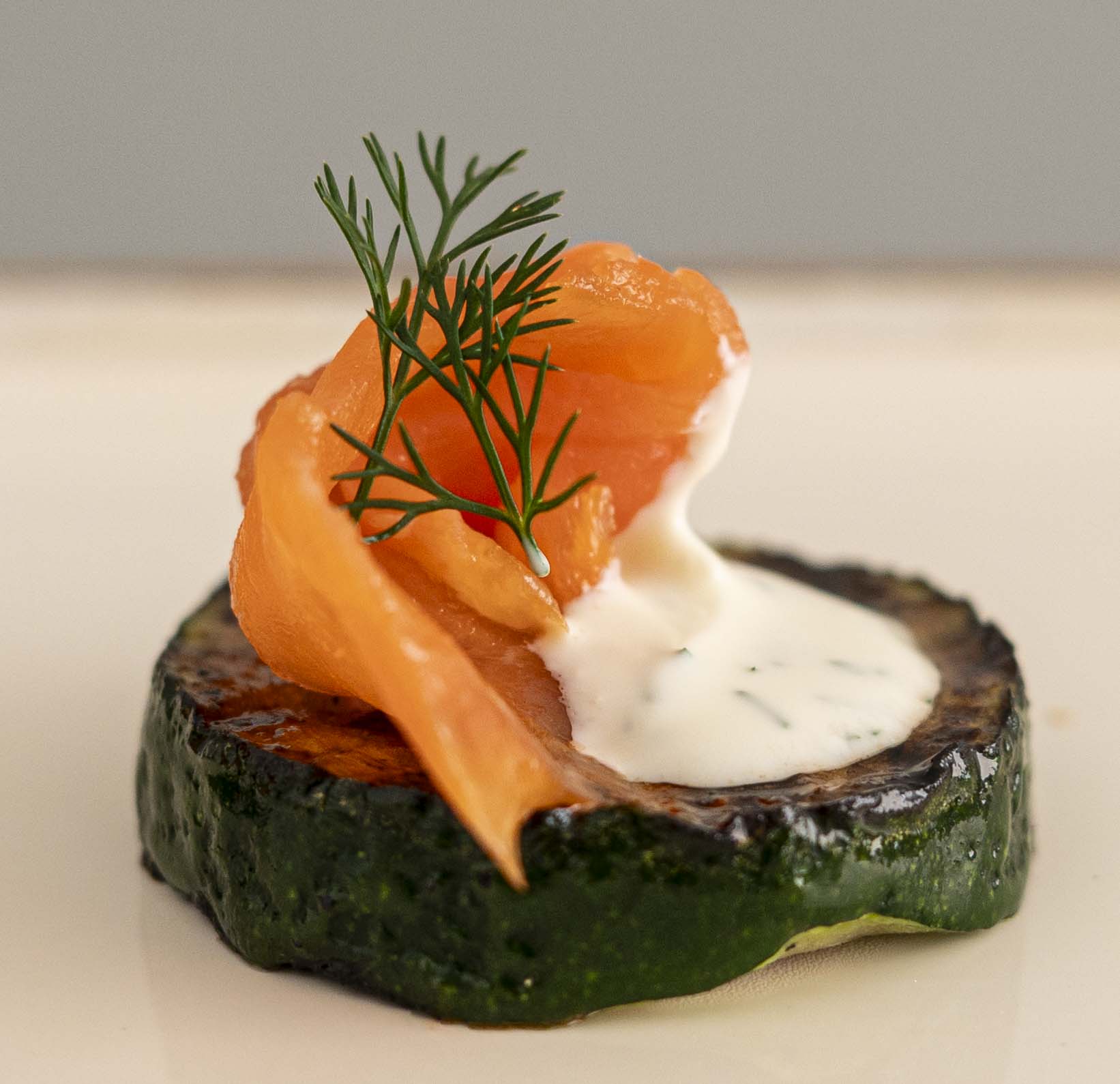 Feta, cream cheese, lemon & chivemousse on a blinis with smoked salmon& fresh dill.
