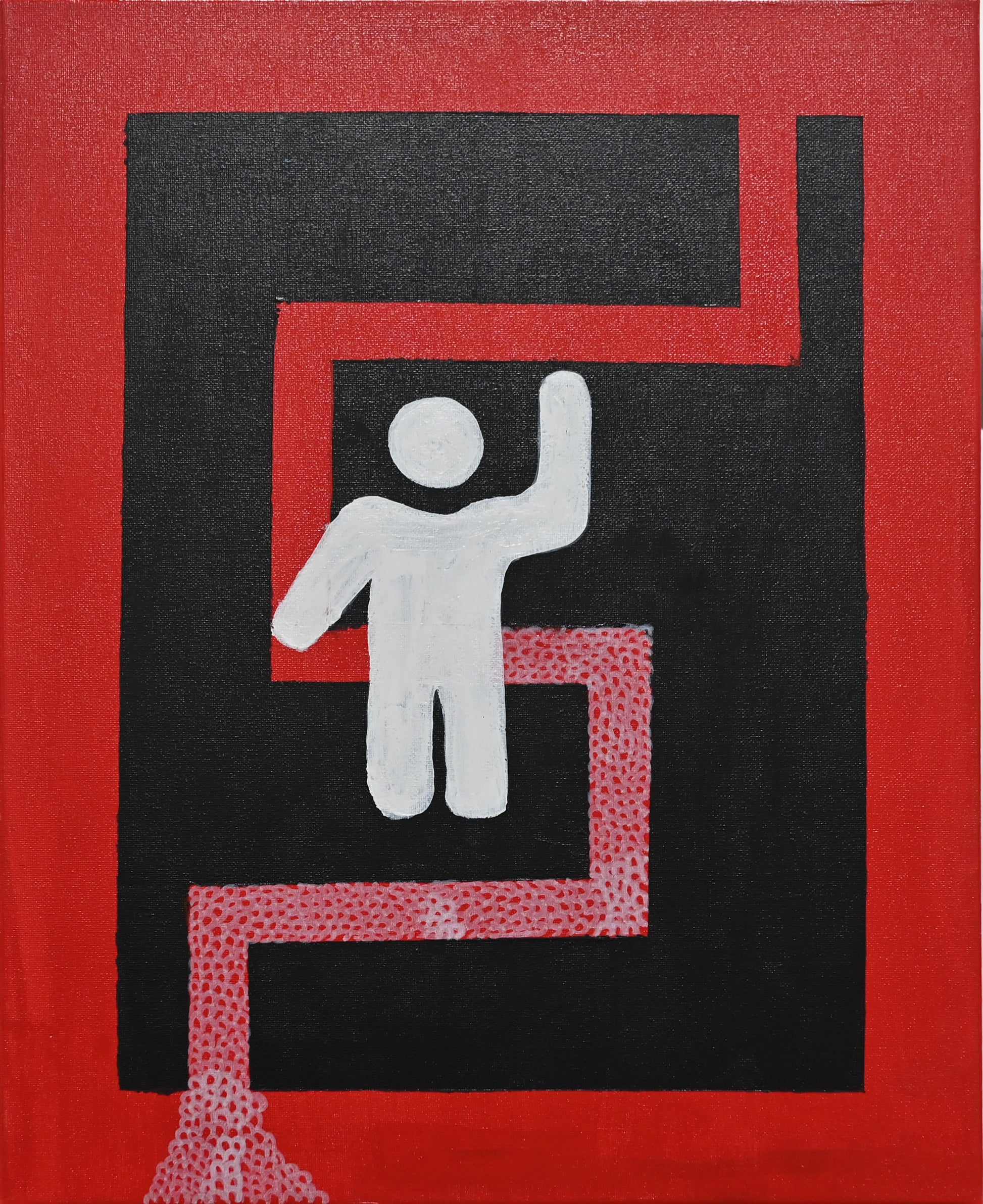 At the center of the maze, a small white figure climbs, leaving a trail behind it—a subtle reminder of the progress made, but also the struggle that continues. The figure’s journey is a reflection of both individual and collective perseverance, navigating the ways in which power, history, and society intersect.