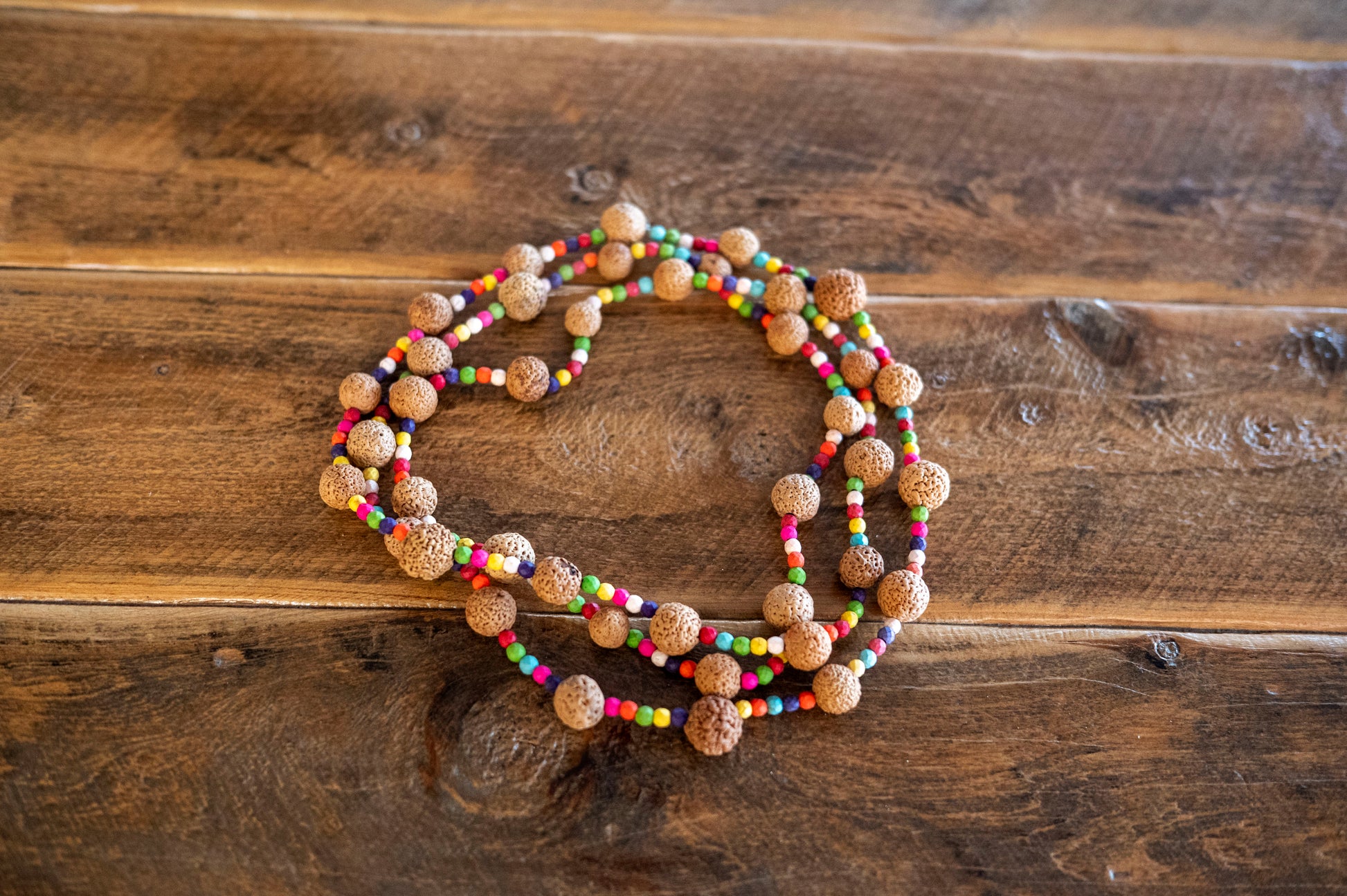 Long quandong and seed beads necklace.
