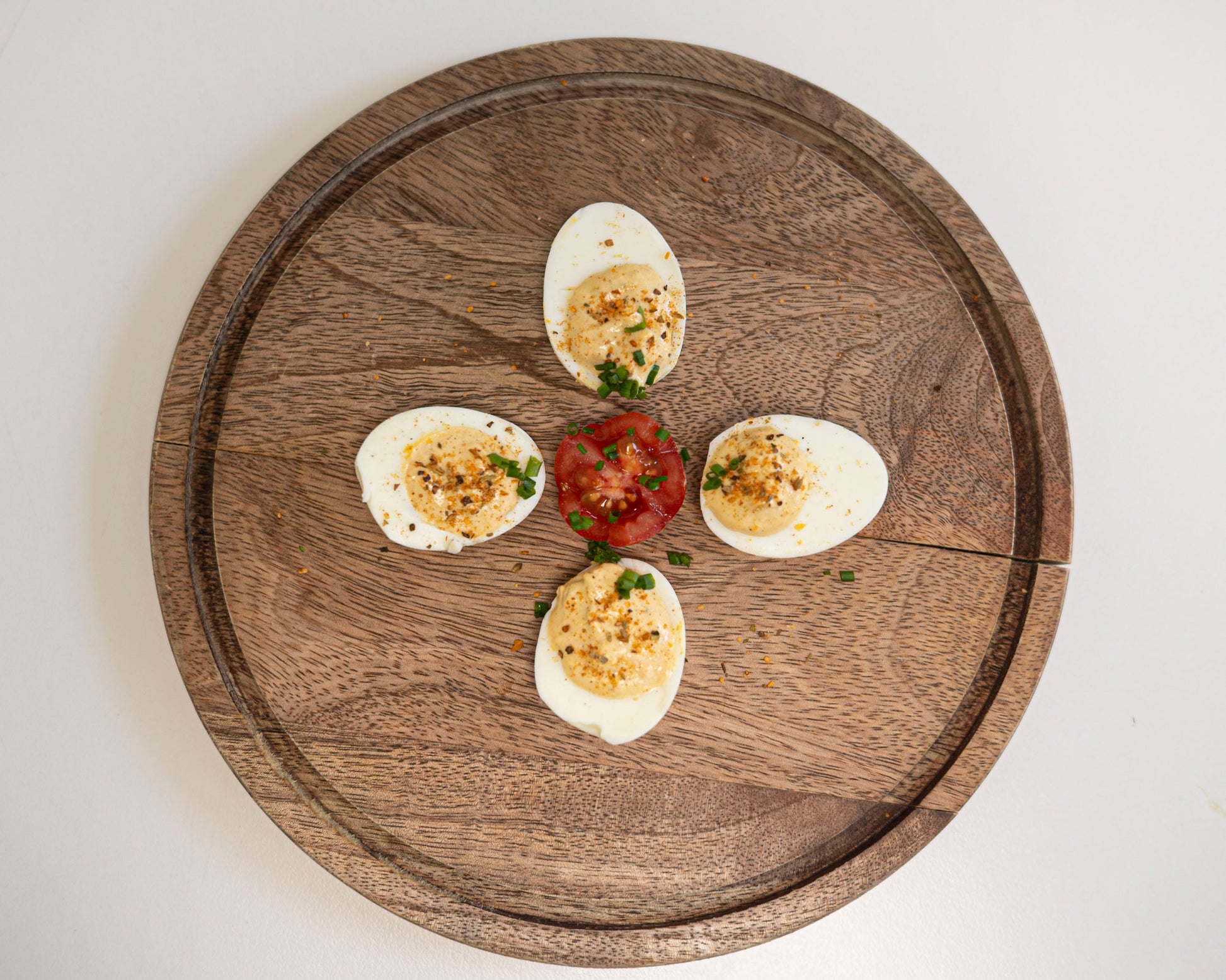 A Native twist on devilled eggs withLemon Aspen & Pepperberry.Vegetarian