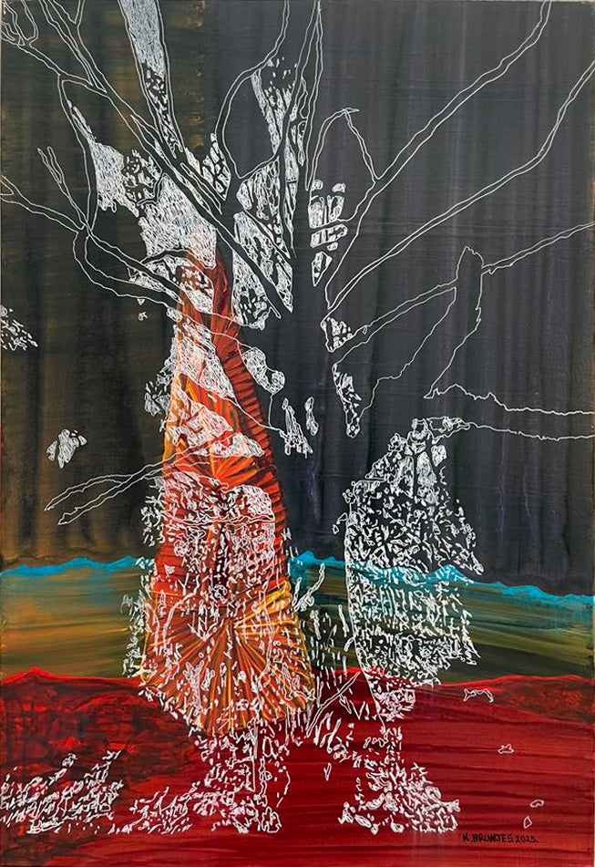 The Cypress pine centre to the middle is an old pine I was shown while at work, probably the oldest tree to knowledge that I’ve seen. This area has been managed over the years, going back to our Old people so being in this area was quite significant. The area behind the Pine displays a theatre-like feeling, with a dark curtain being pulled from left to right. This signifies the learning of Country, being shown and told things from Countrymen/those with connection to various areas, and seeing a vision of how our Old people lived. This site also had shells throughout and the talk of shell middens came into conversation, represented in the white, chalk looking spaces seen around the piece. The red in the foreground captures a story of fire, highlighting its use in the management of Country.