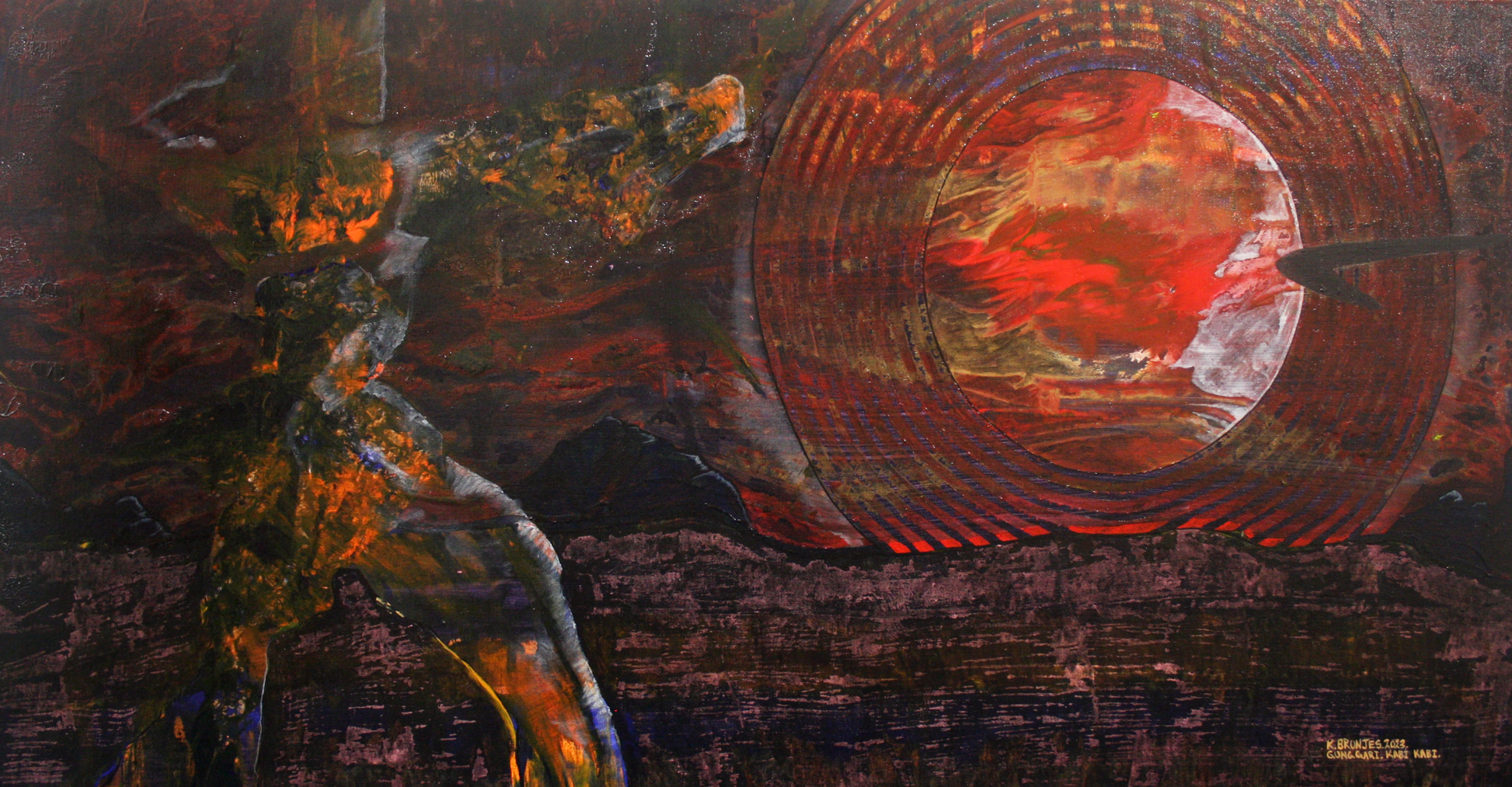 A Warrior is seen throwing a boomerang through an area of country. The circle area provides a portal viewing, as though the past and the future are looking at each other.