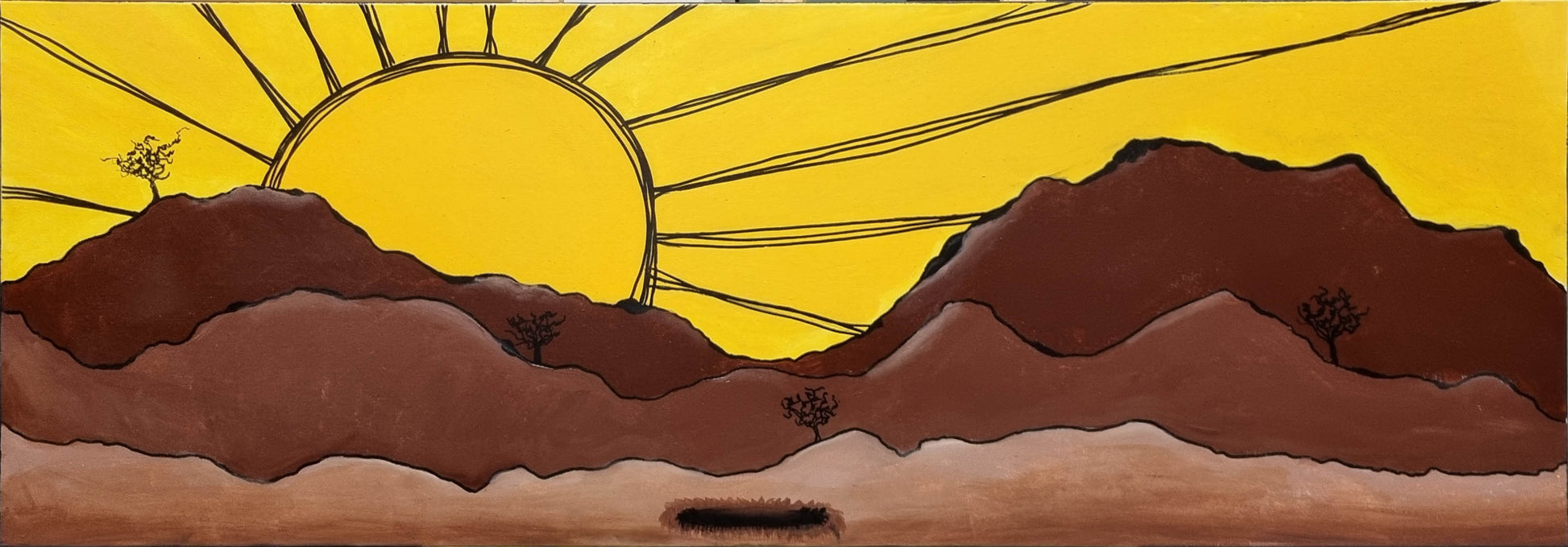 This artwork shows a broad, sunlit mountainside with strewn trees scattered throughout. This image is a representation of Australian land and culture, and symbolism of the community. On the bottom of the painting is a pit, this pit serves as a metaphor for the tension that arose during the referendum and illustrates how it can negatively impact a community, similarly to how an entire ecosystem is affected by change.