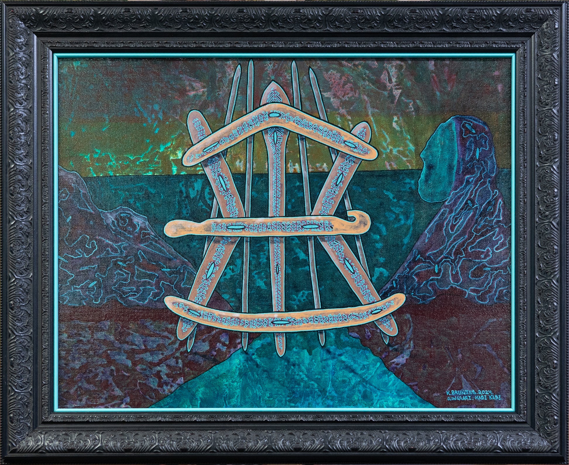 Painted is a Shadow Box, a make up of boomerangs, spears and a Nulla Nulla. This references pieces of art that are created in memory of loved ones passed on. My first thought when seeing a Shadow Box is of Cherbourg and Murgon, Wakka Wakka Country, and the artists that have created these in the past and still do today. I draw great strength and appreciation from growing up in Murgon, and a lot of what I do is connected back to being surrounded and learning from stories shared while on or from Country there. This work acknowledges all that has been gifted to us by the Ancestors with memory to the lives they lived and the impact they’ve had on the communities they were in. This brings thought to my life and the consideration to the paths I walk or will walk.