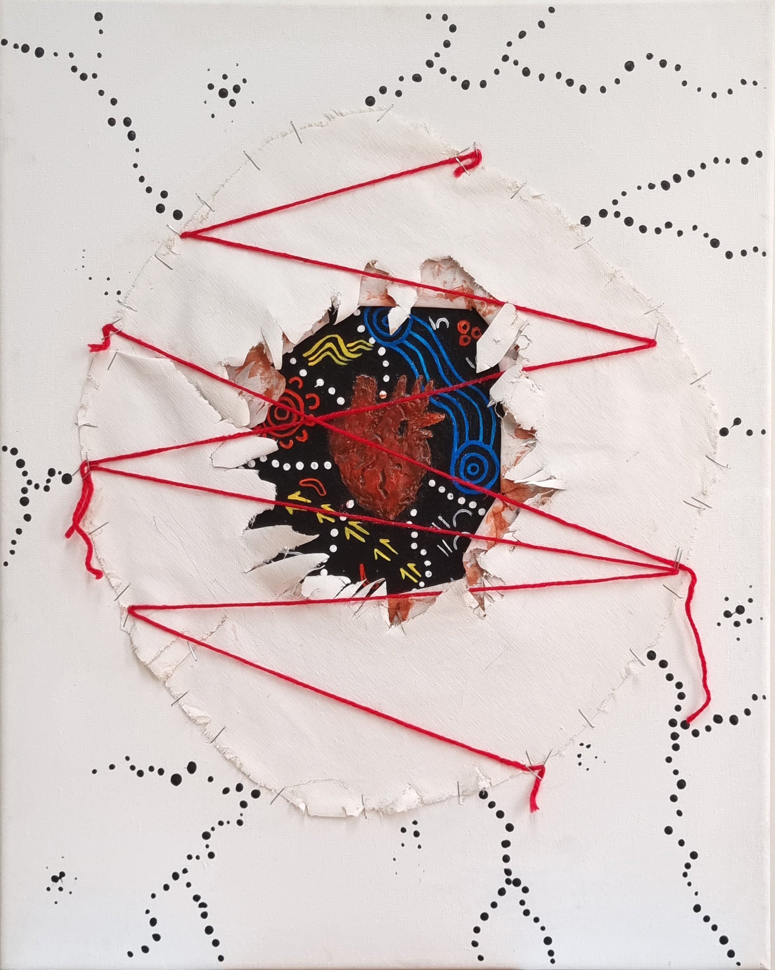 ‘The Journey’ represents the fight that Aboriginal people, particularly our Elders and ancestors have taken to reveal the beauty of Aboriginal culture. Despite the intense struggles and bloodshed, that has been hidden and locked away, our ancestors and Elders give us strength to break through and relearn. This particular artwork uses many symbols to represent this. The heart in the middle of the canvas represents Aboriginal culture, and the ancestors who have passed on. The artwork surrounding the heart represents storytelling, our Elders and the land. A large piece of canvas is surrounding this artwork, this has been made to look rough, hastily stapled on and as if it has been ripped open from the inside. The canvas represents the attempt to cover up Aboriginal culture, with red string symbolising the bloodshed that it resulted in. Finally, the dotted artwork on the outside of the canvas, represents a new generation of Aboriginal people learning about the culture, the land, the people, and the stories. It has been made to look like veins to tie in with the heart to show how our ancestors guide us through this Journey.