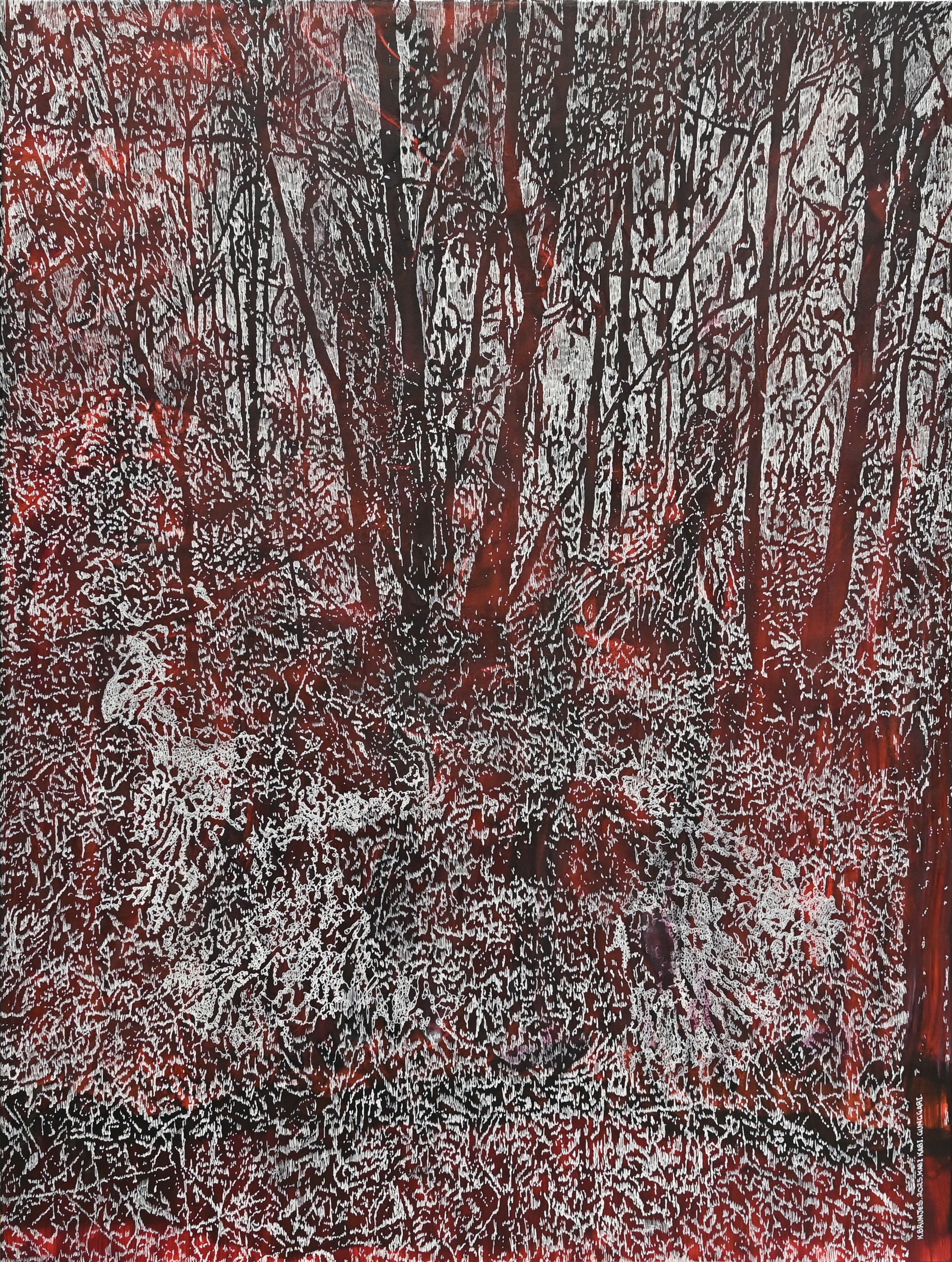 Displayed is the start of a small fire in the bush, one part of the process to a controlled burn. The flames/fire are depicted in the dense areas of white in the bottom half of the canvas, and in the colours of the background.