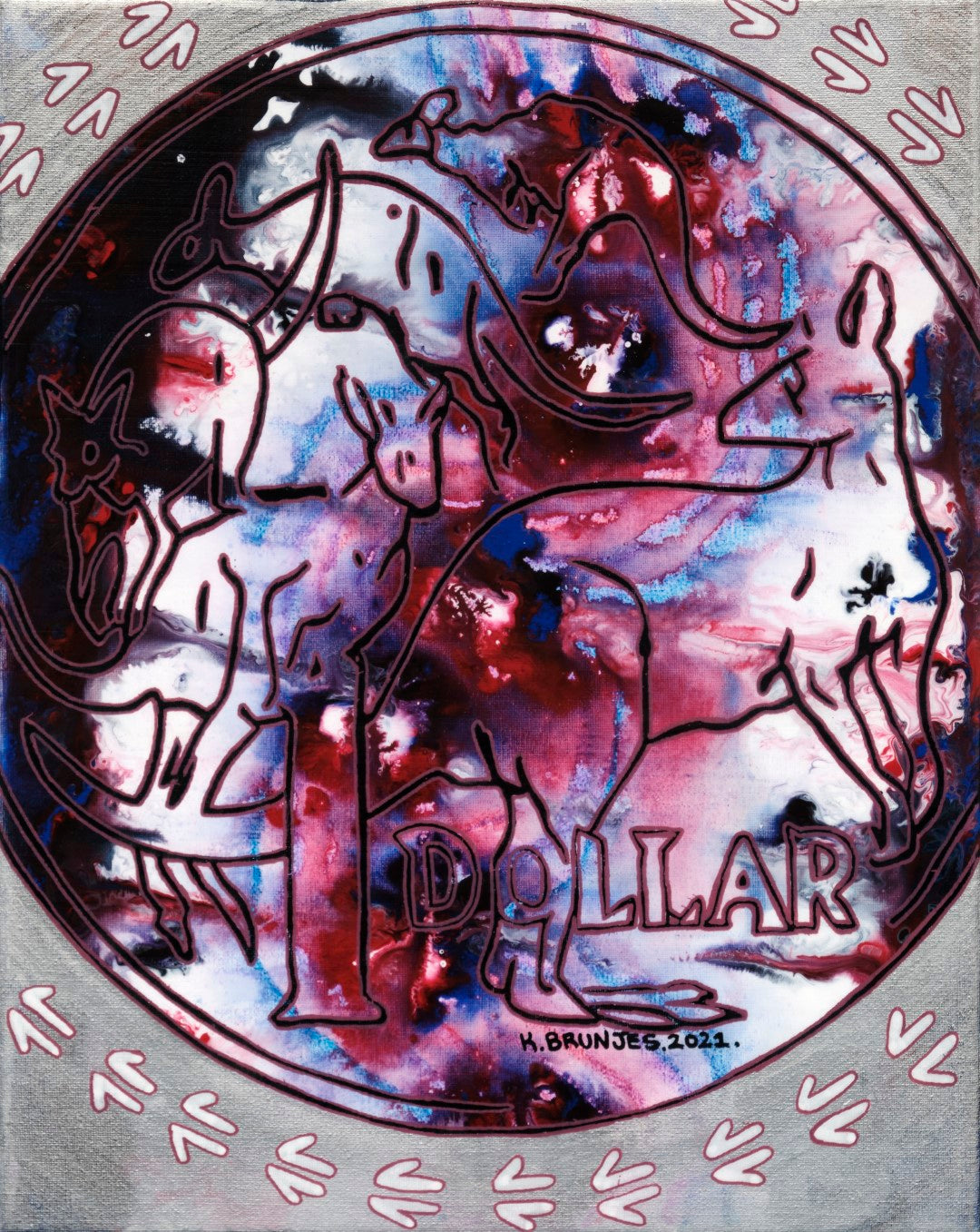 Seen in the painting is a representation of the dollar coin with a body of water flowing through the middle.